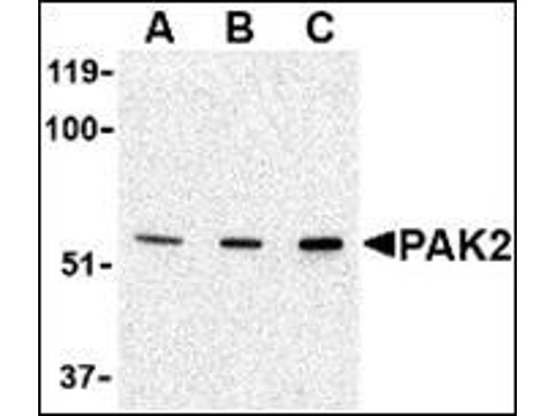 The p21-activated kinases (PAKs) are serine-threonine kinases that bind to the active forms of Cdc42 and Rac. They are divided into two groups, the first of which include PAK1, 2 and 3, and can be activated by Cdc42/Rac binding. Group 1 PAKs contain an autoinhibitory domain whose activity is regulated by Cdc42/Rac binding. The group 1 PAKs are known to be involved in cellular processes such as gene transcription, apoptosis, and cell morphology and motility. Much less is known about the second group, which includes PAK4, 5 and 6, and are not activated by Cdc42/Rac binding. Of the six PAK proteins, only PAK2 is ubiquitously expressed and cleaved by caspase-3. This cleavage removes the amino-terminal regulatory domain and generates a constitutively active kinase fragment. Recent experiments have shown that following cleavage, the active fragment is myristoylated and directed to the plasma membrane and membrane ruffles where it promotes cell death via increased signaling through the c-Jun N-terminal kinase pathway, but without compromising mitochondrial integrity.Synonyms: Gamma-PAK, PAK 2, PAK gamma, PAK-2, PAK65, Serine/threonine-protein kinase PAK 2, p21-activated kinase 2, p58