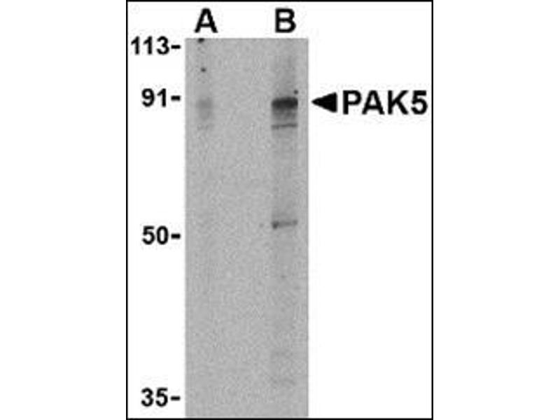 The p21-activated kinases (PAKs) are serine-threonine kinases that bind to the active forms of Cdc42 and Rac. They are divided into two groups, the first of which include PAK1, 2 and 3, and can be activated by Cdc42/Rac binding. Group 1 PAKs contain an autoinhibitory domain whose activity is regulated by Cdc42/Rac binding. The group 1 PAKs are known to be involved in cellular processes such as gene transcription, apoptosis, and cell morphology and motility. Much less is known about the second group, which includes PAK4, 5 and 6. These proteins are not activated by Cdc42/Rac binding. PAK5 was initially identified as a kinase expressed primarily in brain that while possessing a kinase domain and GTPase binding domain similar to PAK4 and PAK6, is completely different from both. Expression of PAK5 in neural based cell lines resulted in neurite outgrowth suggesting that PAK5 may be involved in regulating the cytoskeletal changes necessary for promoting neurite outgrowth. Other experiments suggest that unlike the other PAKs, PAK5 may inhibit apoptosis by phosphorylating the Bcl-2 family member Bad.Synonyms: KIAA1264, PAK-5, PAK-7, Serine/threonine-protein kinase PAK 7, p21-activated kinase 5, p21-activated kinase 7