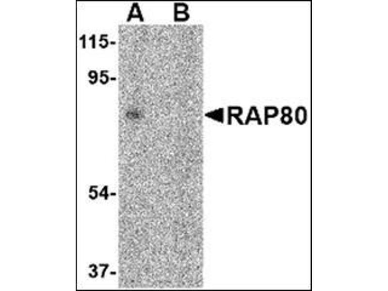 RAP80 was initially identified as zinc-finger containing nuclear protein that is highly expressed in testis and interacts with the retinoid-related testis-associated receptor (RTR). Later experiments revealed that RAP80 is recruited by the Coiled-coil domain 98 (CCDC98) protein to the breast cancer-1 protein BRCA1, allowing the formation of BRCA1 foci in response to DNA damage caused by ionizing radiation. Both RAP80 and CCDC98 are required for DNA damage resistance, G2-M checkpoint control, and DNA repair. Cells depleted of either RAP80 or CCDC98 exhibited increased sensitivity to ionizing radiation, although not as much as in BRCA1-depleted cells, suggesting that RAP80 and CCDC98 control only part of the DNA damage response role of BRCA1. At least four isoforms of RAP80 are known to exist.Synonyms: BRCA1-A complex subunit RAP80, RXRIP110, Receptor-associated protein 80, Retinoid X receptor-interacting protein 110, Ubiquitin interaction motif-containing protein 1