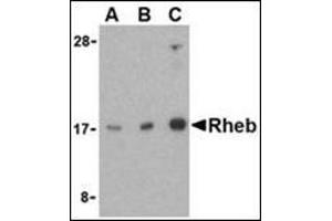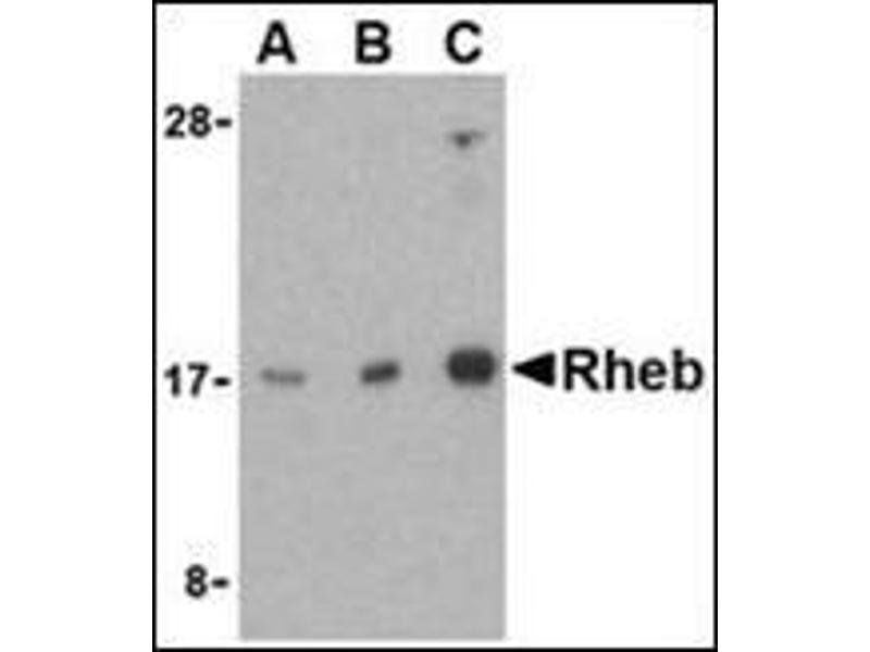 Rheb (Ras homolog enriched in brain) is an evolutionarily conserved member of the Ras family of small GTP-binding proteins originally found to be rapidly induced by synaptic activity in the hippocampus following seizure (1). While it is expressed at relatively high levels in the brain, Rheb is widely expressed in other tissues and may be induced by growth factor stimulation. Similar to other family members, Rheb triggers activation of the Raf-MEK-MAPK pathway (2). Biochemical and genetic studies demon-strate that Rheb has an important role in regulating the insulin/Target of rapamycin (TOR) signaling pathway (3-5). TOR is a serine/threonine protein kinase that acts as a sensor for ATP and amino acids, balancing the availability of nutrients with protein translation and cell growth. A dimeric protein complex termed TSC1/TSC2 indirectly inhibits TOR activity by inhibiting Rheb via the GAP activity of TSC2 (3).Synonyms: GTP-binding protein Rheb, RHEB2, Ras homolog enriched in brain