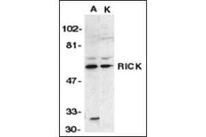 Apoptosis is mediated by death domain (DD) and/or caspase recruitment domain (CARD) containing molecules and a caspase family of proteases. DD-containing serine/threonine kinase RIP regulates Fas-induced apoptosis. A novel CARD-containing serine/threonine kinase was recently identified and designated RICK/RIP2/CARDIAK for RIP-like interacting CLARP kinase, receptor interacting protein-2, and CARD-containing ICE associated kinase, respectively, (1-3). RICK contains an N-terminal kinase catalytic domain and a C-terminal CARD domain. Overexpression of RICK induced apoptosis and activation of NF-kappaB and JNK. RICK interacts with members of the TRAF family, CLARP and caspase-1. Thus, RICK represents a novel kinase that regulates TNF and Fas induced-apoptosis and that is involved in the generation of proinflammatory cytokine IL-1b. The messenger RNA of RICK is expressed in multiple human tissues.Synonyms: CARD-containing IL-1 beta ICE-kinase, CARDIAK, RICK, RIP-2, RIP-like-interacting CLARP kinase, RIP2, Receptor-interacting protein 2, Receptor-interacting serine/threonine-protein kinase 2