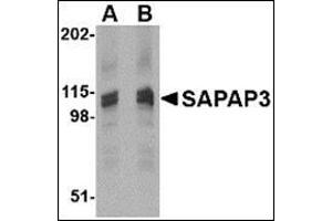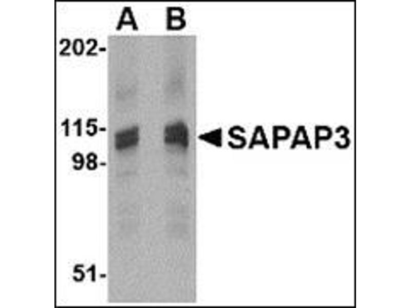 SAP90/PSD-95-associated protein 3 (SAPAP3, also known as DLGAP3) is a member of a protein family whose members specifically interact with PSD-95/SAP90, a membrane-associated guanylate kinase localized at postsynaptic density (PSD) in neuronal cells. Like the other SAPAP proteins, SAPAP3 is thought to be an adaptor protein that also interacts with different synaptic scaffolding proteins, cytoskeletal and signaling components, such as focal adhesion kinase (FAK) and proline-rich tyrosine kinase 2 (PYK2). Both SAPAP3 protein and mRNA are targeted to dendrites, whereas SAPAP1, -2, and -4 mRNAs are detected mainly in cell bodies. Recent experiments have suggested that SAPAP3 may be involved in obsessive-compulsive disorder (OCD), as mice lacking SAPAP3 exhibited OCD-like symptoms which could be relieved by lentiviral-mediated selective expression of SAPAP3 in the striatum of SAPAP3-mutant mice. At least two isoforms are known to exist.Synonyms: DAP-3, DAP3, Disks large-associated protein 3, PSD-95/SAP90-binding protein 3, SAP90/PSD-95-associated protein 3, SAPAP3