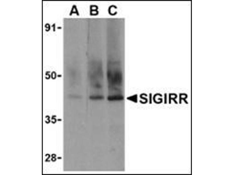 SIGIRR is a member of the Toll-like receptor-interleukin 1 receptor superfamily. Members of this family are defined by the presence of an intracellular Toll-IL-1R (TIR) domain. The Toll-like receptors (TLRs) are signaling molecules that recognize different microbial products during infection and serve as an important link between the innate and adaptive immune responses (1,2). SIGIRR was originally identified through database analysis and was shown to have only one Ig domain as opposed to the normal three Ig folds seen in the TIR family (3). Similar to ST2, another TIR family member, it has been shown to negatively regulate IL-1 receptor and Toll-like receptor signaling (4,5). However, SIGIRR inhibits TLR-IL-1R signaling by dimerizing with TLR4, TLR5, TLR9, and IL-1R. It also associates with the down-stream TLR signaling proteins IRAK and TRAF6 in an IL-1-dependent fashion (4).Synonyms: Single Ig IL-1-related receptor, Single Ig IL-1R-related molecule, Single immunoglobulin domain-containing IL1R-related protein, Toll/interleukin-1 receptor 8, UNQ301/PRO342