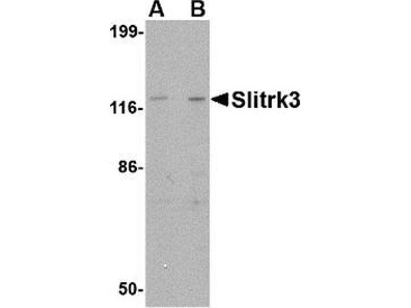 SLIT and NTRK-like family 3 (Slitrk3) is a member a protein family consisting of six homologous transmembrane proteins (Slitrk1-6) that share two conserved leucine-rich repeat domains in the extracellular domain and have significant homology to Slit, a secreted axonal growth-controlling protein. These proteins are also homologous to trk neurotrophin receptors in their intracellular domains. Expression of Slitrk proteins is highly restricted to neural and brain tumor tissues, but varies within the protein family. Like every other Slitrk protein except Slitrk1, overexpression of Slitrk3 inhibited neurite outgrowth in cultured neurons, suggesting that these proteins are involved in the control of neurite outgrowth. This antibody is predicted to have no cross-reactivity to other Slitrk proteins.Synonyms: KIAA0848, SLIT and NTRK-like protein 3