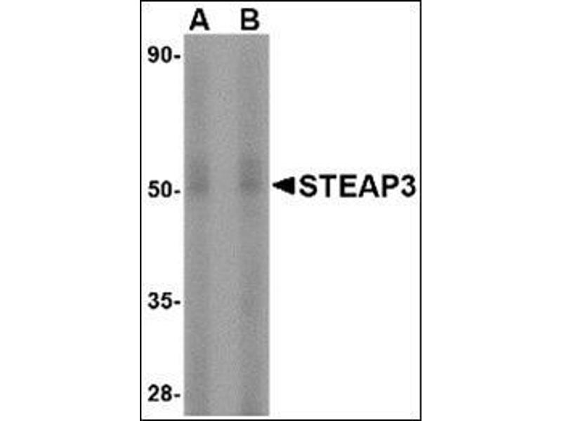 The six-transmembrane epithelial antigen of prostate 3 (STEAP3) is a member of a family of metalloreductases identified as cell-surface antigens in prostate tissue. Similar to two other members of the STEAP family (STEAP 2 and STEAP4), STEAP3 promotes both iron and copper reduction. STEAP3 is highly expressed in hematopoietic tissues and colocalizes with the transferrin endosome. Overexpression of STEAP3 stimulates iron reduction, mice lacking STEAP3 are deficient in erythroid ferrireductase activity, suggesting that STEAP3 is an endosomal ferrireductase required for transferrin-dependent iron uptake in erythroid cells.Synonyms: Dudulin-2, Metalloreductase STEAP3, STEAP-3, Six-transmembrane epithelial antigen of prostate 3, Tumor suppressor-activated pathway protein 6, pH yde