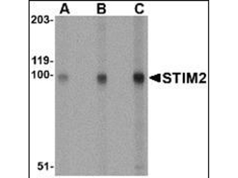 In T lymphocytes, the sole pathway for Ca++ entry following antigen-receptor binding is through store-operated Ca++-release-activated Ca++ (CRAC) channels. These channels are made up of the pore-forming subunit ORAI1 and the stromal interaction molecule 1 (STIM1), a protein that functions as a Ca++ sensor and activates the CRAC channels, migrating to the plasma membrane from endoplasmic reticulum (ER)-like sites which act as the Ca++ store. A related molecule, STIM2, acts to inhibit the STIM1-mediated store-operated Ca++ entry, and can form complexes with STIM1, suggesting they may play a coordinated role in controlling Ca++ entry. At least three isoforms of STIM2 are known to exist. This STIM2 antibody is predicted to have no cross-reactivity to STIM1.Synonyms: KIAA1482, Stromal interaction molecule 2
