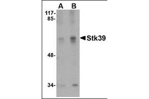 The serine/threonine kinase Stk39 belongs to the STE20 family, a group of kinases that are known to interact with inflammation-related kinases (such as p38, JNK, NKCC1, PKC-theta, WNK and MLCK), and with transcription factor AP-1. The STE 20 family is involved in diverse biological phenomena, including cell differentiation, cell transformation/ proliferation, cytoskeleton rearrangement, and the regulation of ion transporters. STK39 contains an N-terminal series of proline and alanine repeats (PAPA box), followed by a serine/threonine kinase catalytic domain and is abundantly expressed in the brain. STK39 is activated in response to hypotonic stress, leading to phosphorylation of several cation-chloride-coupled co-transporters. The catalytically active kinase specifically activates the p38 MAP kinase pathway, and its interaction with p38 decreases upon cellular stress, suggesting that this kinase may serve as an intermediate in the response to cellular stress. Recent studies show that STK39 tend to be a novel candidate gene for autism and hypertension.Synonyms: DCHT, STE20/SPS1-related proline-alanine-rich protein kinase, Serine/threonine-protein kinase 39, Ste-20-related kinase
