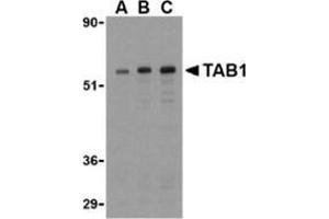 TAB1 was identified as a regulator of the MAP kinase kinase kinase TAK1/MAP3K7 (1), which is known to mediate various intracellular signaling pathways, such as those induced by TGF-beta and members of the Toll-IL-1R (TIR) superfamily (2), thus acting as an intermediate in both proliferative and innate and adaptive immune responses (3). This protein, together with either TAB2 or TAB3, activates TAK1 kinase in response to upstream signals (4,5). It has been shown that the C-terminal portion of TAB1 is sufficient for binding and activation of TAK1, while a portion of the N-terminus acts as a dominant-negative inhibitor of TGF-beta, demonstrating how this protein can function as a mediator between TGF-beta receptors and TAK1 (6).Synonyms: Mitogen-activated protein kinase kinase kinase 7-interacting protein 1, TAK1-binding protein 1, TGF-beta-activated kinase 1-binding protein 1