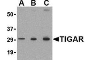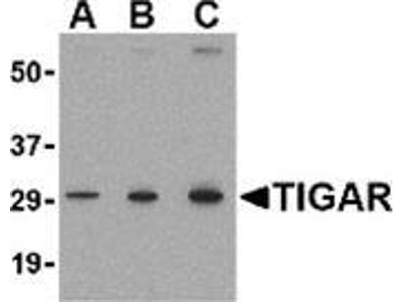 The p53 tumor-suppressor gene integrates numerous signals that control cell life and death, loss of its functions contributes to the development of most cancers. Recent studies have demonstrated the ability of p53 to regulate the expression of several proteins involved in glycolysis and oxidative phosphorylation, such as TIGAR, SCO2, and phosphoglycerate mutase. TIGAR is a recently discovered protein that functions to regulate glycolysis and protect cells against oxidative stress. TIGAR is similar in structure to proteins in the phosphoglycerate mutase family, most notably 6-phosphofructo-2-kinase, suggesting TIGAR may function as a fructose bisphosphatase. Expression of TIGAR in transfected cells correlated with an inhibition of glycolysis and decreased levels of reactive oxygen species and p53-induced apoptosis, indicating that TIGAR may act to modulate the apoptotic response to p53, thereby allowing cells to survive mild or transient stresses.Synonyms: 6-bisphosphatase TIGAR, C12orf5, Probable fructose-2, TP53-induced glycolysis and apoptosis regulator