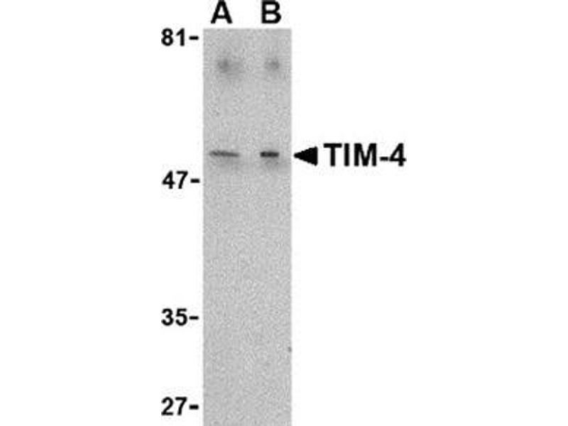 The T cell immunoglobulin and mucin domain containing protein (TIM) family encodes cell surface receptors that are involved in the regulation of T helper (Th) -1 and -2 cell-mediated immunity. TIM-4, which is preferentially expressed on macrophages and dendritic cells, is the natural ligand of TIM-1, and this binding leads to T-cell expansion and cytokine production. Unlike other members of the TIM family, TIM-4 lacks a putative tyrosine phosphorylation signal sequence in its intracellular domain. The TIM-4 gene maps to a locus associated with predisposition to asthma in both mice and humans and with its connection to TIM-1-triggered Th2 responsiveness, may be considered as a candidate disease/predisposition gene for asthma.Synonyms: T-cell immunoglobulin and mucin domain-containing protein 4, T-cell membrane protein 4, TIM-4, TIM4, TIMD-4