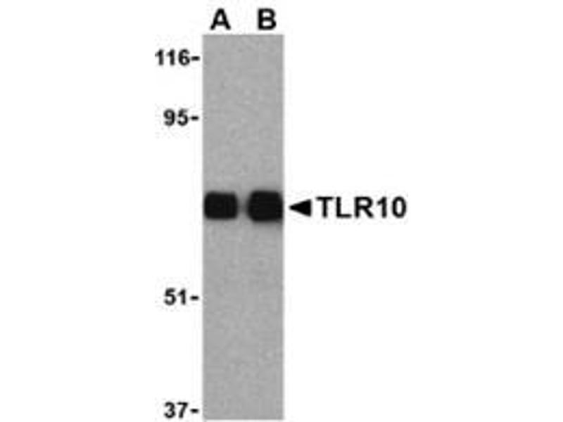 Toll-like receptors (TLRs) are signaling molecules that recognize different microbial products during infection and serve as an important link between the innate and adaptive immune responses (1-3). These proteins act through adaptor molecules such as MyD88 and TIRAP to activate various kinases and transcription factors (4,5). TLR10 is highly homologous to TLRs 1 and 6 and is most highly expressed in lymphoid tissues (6). Most recently genetic variation in TLR10 has been associated with contributing to asthma risk (7). It should be noted that TLR10 exists in mice only as a pseudogene (8).Synonyms: Toll-like receptor 10, UNQ315/PRO358