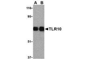 ELISA. Western blot: 0.5 to 1 μg/mL. Despite its predicted size of approx. 90 kDa, a band correpsondingto TLR10 is observed at approx. 75 kDa in immunoblot assays. Other applications not tested. Optimal dilutions are dependent on conditions and should be determined by the user.