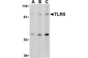 Toll-like receptors (TLRs) are evolutionarily conserved pattern-recognition molecules resembling the toll proteins that mediate antimicrobial responses in Drosophila. These proteins recognize different microbial products during infection and serve as an important link between the innate and adaptive immune responses (1,2). The TLRs act through adaptor molecules such as MyD88 and TIRAP to activate various kinases and transcription factors (3) so the organism can respond to potential infection. TLR5 recognizes flagellin from both Gram-positive and Gram-negative bacteria and will cause the activation of NF-κB, leading to the activation of TNF-? and other cytokines (4). A common TLR5 stop codon polymorphism that disrupts TLR5 signaling is associated with susceptibility to Legionnaires' disease and demonstrates the importance of TLR5 in the innate immune response (5).Synonyms: TIL3, Toll-like receptor 5, Toll/interleukin-1 receptor-like protein 3
