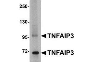 TNFAIP3, also known as A20, is located in chromosome band 6q23, a region that is often deleted in B cell lymphomas. Recently, it was identified as a tumor suppressor gene in Hodgkin lymphoma and several subtypes of non-Hodgkin lymphomas. TNFAIP3 was initially identified as a zinc-finger protein that is rapidly and transiently induced by TNF-a, inhibiting NF-kB-dependent gene expression, and protecting cells from TNF-a-cytotoxicity. Overexpression of TNFAIP3 also inhibits the TLR2- and TLR4-mediated interleukin-8 synthesis in airway epithelial cells, suggesting that TNFAIP3 also acts as a negative regulator of TLR-mediated inflammatory responses, thereby protecting the host against harmful over-responses to pathogens. At least two isoforms of TNFAIP3 are known to exist.Synonyms: OTU domain-containing protein 7C, OTUD7C, Putative DNA-binding protein A20, Tumor necrosis factor alpha-induced protein 3, Zinc finger protein A20