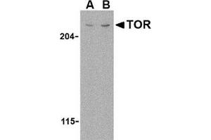 The mammalian Target of Rapamycin (TOR, also known as mTOR) is an evolutionarily conserved serine/threonine kinase that regulates cell growth and cell cycle through its ability to integrate signals from nutrient levels and growth factors (reviewed in 1). It was initially discovered as a kinase whose ability to stimulate T cell proliferation in response to IL-2 could be inhibited by the immunosuppressive drug rapamycin (2,3). Rapamycin inhibits TOR in other cell types resulting in reduced cell growth and reduced rates of cell cycle and cell proliferation (reviewed in 4). TOR is normally associated with the regulatory proteins RAPTOR and GbetaL. Its downstream targets are thought to be the ribosomal protein S6 kinases and the eukaryotic initiation factor 4E binding proteins (4EBPs). Regulation of these protein families allows TOR to control protein biosynthesis (4).Synonyms: FK506-binding protein 12-rapamycin complex-associated protein 1, FKBP12-rapamycin complex-associated protein, FRAP, FRAP2, Mammalian target of rapamycin, RAPT1, Rapamycin target protein, Serine/threonine-protein kinase mTOR, TOR