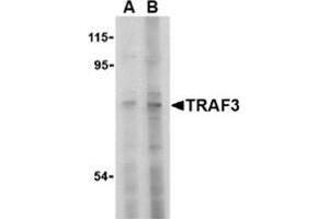 Tumor necrosis factor (TNF) receptor associated factors (TRAFs) are the major signal transducers for the TNF receptor superfamily and the interleukin-1 receptor/Toll-like receptor (IL-1/TLR) superfamily (1). TRAF3 was first identified by its interaction with CD40 and the Epstein-Barr virus transforming protein LMP1 (2,3). Several TRAF3 mRNA splice variants exist and some of these can activate the transcription factor NF-kappaB (4). Besides CD40, TRAF3 also interacts with the TRFR superfamily member lymphotoxin-beta receptor (LTbetaR) in association with TRAF2 and the apoptosis inhibitors cIAP1 and Smac. It has been suggested that TRAF3 induces mitochondria-mediated apoptosis upon binding of the TNF family cytokine LIGHT by LTbetaR.Synonyms: CAP-1, CAP1, CD40 receptor-associated factor 1, CD40-binding protein, CD40BP, LAP1, LMP1-associated protein, TNF receptor-associated factor 3