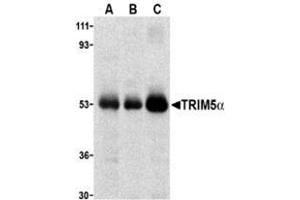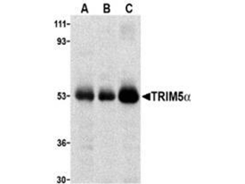TRIM5 is a member of a broad family of otherwise unrelated proteins defined by the presence of a tripartite motif containing a RING domain, a B-box type 1, and a B-box type 2, followed by a coiled-coil region (1). TRIM5 has six alternately spliced isoforms, the longest of which is the ? variant which also contains a carboxy-terminal B30.2 (SPRY) domain (1). Expression of TRIM5alpha variants from humans, rhesus monkeys, and African green monkeys enabled resistance to infection by various retroviruses including HIV-1 (2,3), albeit at differing efficiencies. All TRIM5alpha variants could inhibit at least two different retroviruses, but not from those viruses isolated from the same species, suggesting that TRIM5alpha acts as a natural barrier to cross-species retrovirus transmission (3).Synonyms: RING finger protein 88, Tripartite motif-containing protein 5