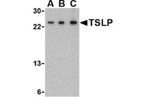 Thymic stromal lymphopoietin (TSLP) has recently been identified as an important factor capable of driving dendritic cell maturation and activation. TSLP is a four-helix-bundle cytokine that is expressed mainly by barrier epithelial cells and is a potent activator of several cell types such as myeloid dendritic cells. TSLP is involved in the positive selection of regulatory T cells, maintenance of peripheral CD4+ T cell homeostasis and the induction of CD4+ T cell-mediated allergic reaction. TSLP is also capable of supporting the growth of fetal liver and adult B cell progenitors and their differentiation to the IgM-positive stage of B cell development. Amino acid sequence analysis has shown poor homology between human and mouse TSLP although they exhibit similar biological functions and are expressed in similar tissues. Despite its predicted molecular weight, TSLP often migrates at a higher molecular weight in SDS-PAGE. At least two differentially spliced isoforms of TSLP are known to exist.Synonyms: Thymic stroma-derived lymphopoietin, Thymic stromal lymphopoietin