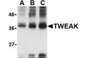 TNF-related weak inducer of apoptosis (TWEAK) is a member of the tumor necrosis factor superfamily (TNFSF) of structurally related cytokines. Like most other members of this family, TWEAK is a cell surface-associated type II transmembrane protein although a smaller, biologically active form can also be generated by cleavage near the cell membrane (1,2). TWEAK has multiple biological activities, including stimulation of cell growth and angiogenesis (3), induction of inflammatory cytokines (4), in addition to stimulation of apoptosis (5). The TWEAK signal transduction pathway has not been well established but it appears to signal via TweakR/Fn14 in a manner similar to that described for other TNFSF members that bind receptors lacking death domains (1). Despite its predicted molecular weight of 27 kDa, TWEAK may migrate at aberrant positions in SDS-PAGE.Synonyms: APO3 ligand, APO3L, DR3LG, TNF-related weak inducer of apoptosis, Tumor necrosis factor ligand superfamily member 12