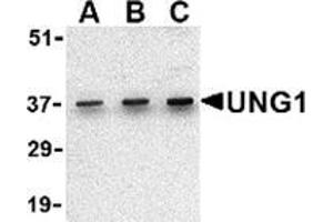 The human uracil-DNA glycosylase (UNG) gene encodes both mitochondrial (UNG1) and nuclear (UNG2) forms through differentially regulated promotes and alternative splicing. While UNG2 is the major enzyme in the base excision repair pathway that removes uracil residues from nuclear DNA that arise through either misincorporation during replication or cytosine deamination, inhibition of UNG1 by uracil glycosylase inhibitor did not lead to increased levels of spontaneous or induced mitochondrial DNA mutations. However, decreased levels of UNG activity and increased oxidative damage to mitochondrial DNA were seen in older mice, suggesting that mitochondrial DNA repair mechanisms may be involved in various neurodegenerative disorders in an age-dependent manner.Synonyms: DGU, UDG, UNG1, UNG15