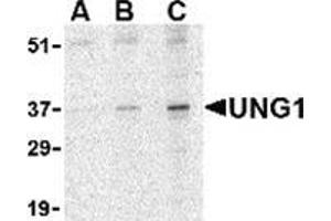 The human uracil-DNA glycosylase (UNG) gene encodes both mitochondrial (UNG1) and nuclear (UNG2) forms through differentially regulated promotes and alternative splicing. While UNG2 is the major enzyme in the base excision repair pathway that removes uracil residues from nuclear DNA that arise through either misincorporation during replication or cytosine deamination, inhibition of UNG1 by uracil glycosylase inhibitor did not lead to increased levels of spontaneous or induced mitochondrial DNA mutations. However, decreased levels of UNG activity and increased oxidative damage to mitochondrial DNA were seen in older mice, suggesting that mitochondrial DNA repair mechanisms may be involved in various neurodegenerative disorders in an age-dependent manner.Synonyms: DGU, UDG, UNG1, UNG15