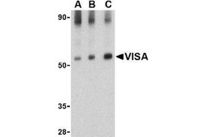 Two distinct signaling pathways activate the host innate immunity against viral infection. One pathway is reliant on members of the Toll-like receptor (TLR) family while the other uses the RNA helicase RIG-I as a receptor for intracellular viral double-stranded RNA as a trigger for the immune response. VISA is a mitochondrial membrane protein that was identified as a critical component in the IFN-b signaling pathways that recruits IRF-3 to RIG-I, leading to its activation and that of NF-kappaB. VISA is also thought to interact with other components of the innate immune pathway such as the TLR adapter protein TRIF, TRAF2 and TRAF6. VISA also interacts with the IKKalpha, IKKbeta and IKKepsilon kinases through its C-terminal region. Cleavage of this region by the Hepatitis C virus (HCV) protease allows HCV to escape the host immune system. At least three isoforms of VISA are known to exist.Synonyms: CARD adapter inducing interferon-beta, Cardif, IPS1, Mitochondrial antiviral-signaling protein, Mitochondrial antiviral-signaling protein, Putative NF-kappa-B-activating protein 031N, VISA, Virus-induced-signaling adapter, nterferon-beta promoter stimulator protein 1
