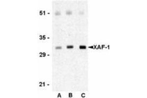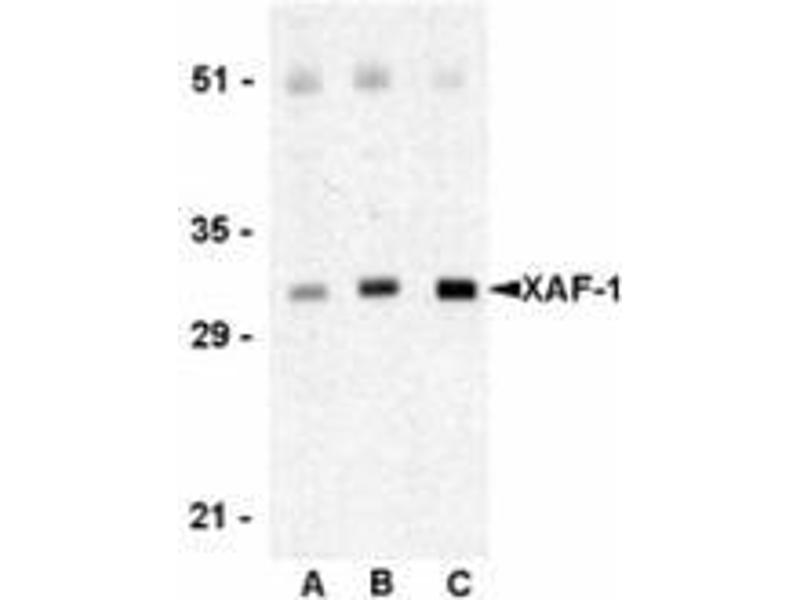 XAF-1 binds to XIAP, an inhibitor of caspases-3, -7, and -9, and triggers its relocation from the cytosol to the nucleus (1,2). Overexpression of XAF-1 results in the neutralization of XIAP\'s ability to inhibit cell death (1). XAF-1 is normally expressed in all adult and fetal tissues but was found to be present in very low levels in a variety of cancer cell lines (3). In contrast, XIAP levels have been shown to be high in a majority of cell lines. Low XAF-1 and high basal expression of XIAP may therefore play a critical role in maintaining survival of cancer cell lines (2,3). Both IFN-alpha2 and IFN-beta can induce XAF-1 mRNA in all cells examined but induction of XAF-1 protein (as observed by immunoblot analysis) was seen only in cell lines sensitive to the apoptotic effects of IFNs (4).Synonyms: BIRC4-binding protein, BIRC4BP, XIAP-associated factor 1, XIAPAF1