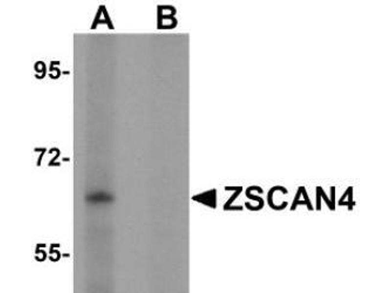 Zytotic genome activation (ZGA) is the first and most critical transition event from the maternal genetic to the embryonic genetic program and the major burst of ZGA occurs only in the late 2-cell stage. ZSCAN4 encodes a SCAN domain and four zinc finger domains and is expressed in late 2-cell embryos and embryonic stem cells. Loss-of-function studies using siRNA shows delays in the progression from the 2-cell to the 4-cell stage and subsequent embryo development. ZSCAN4 plays an important role in the preimplantation development. Also, ZSCAN4 is involved in telomere maintenance and long term genomic stability in ES cells, suggesting that ZSCAN4 may be of critical importance in maintaining pluripotency in replicating stem cells.Synonyms: ZNF494, Zinc finger and SCAN domain-containing protein 4, Zinc finger protein 494