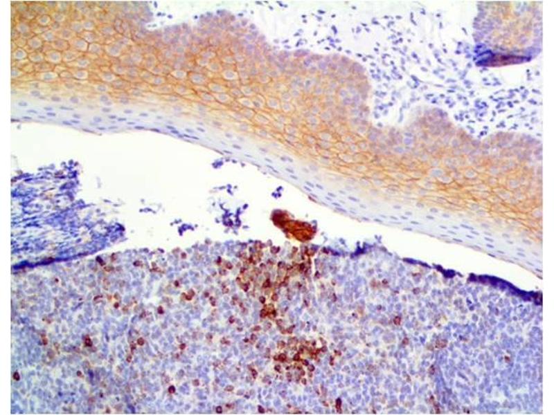 DSG3 (Desmoglein 3) is a calcium-binding transmembrane glycoprotein component of desmosomes, conferring strong cell-cell adhesion. Desmosomes are button-like points of intercellular contact that allow the attachment of cytoskeletal elements to the plasma membrane at sites of cell-cell adhesion. DSG3 is expressed in basal and immediate suprabasal layers of skin. To maintain cell-cell adhesion DSG3 interacts with other desmosomal proteins, such as plakoglobin. Plakoglobin is closely related to Beta-catenin, which is a well-known downstream effector molecule in the canonical Wnt signaling pathway.DSG3 also promotes cancer cell growth and invasion through a plakoglobin-mediated signaling pathway.