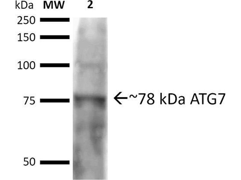 A 1:1000 dilution of ABIN5065900 was sufficient for detection of ATG7 in 15 μg of human HeLa cell lysates by ECL immunoblot analysis using goat anti-rabbit IgG:HRP as the secondary antibody.