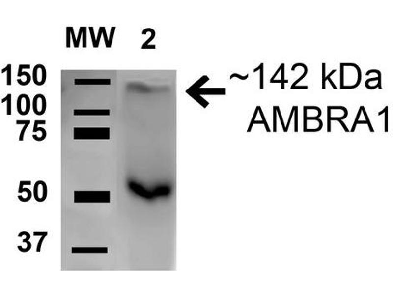 A 1:1000 dilution of ABIN5066204 was sufficient for detection of AMBRA1 in 15 μg of Rat Brain Lysates by ECL immunoblot analysis using goat anti-rabbit IgG:HRP as the secondary antibody.