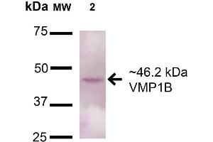 A 1:1000 dilution of ABIN5066459 was sufficient for detection of VMP1 in 15 μg of Human 293T Cell Lysates by ECL immunoblot analysis using goat anti-rabbit IgG:HRP as the secondary antibody.