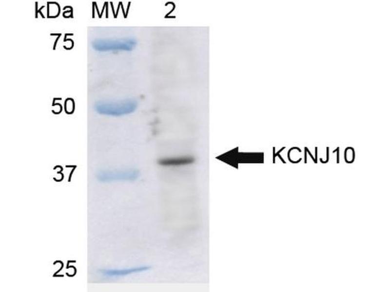 A 1:1000 dilution of ABIN5066659 was sufficient for detection of Kir4.1 in 15 μg of rat liver cell lysates by ECL immunoblot analysis using goat anti-rabbit IgG:HRP as the secondary antibody.