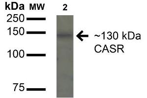 A 1:1000 dilution of ABIN5066816 was sufficient for detection of calcium-sensing receptor (CASR) in 15 μg of Human HeLa Cell Lysates by ECL immunoblot analysis using goat anti-rabbit IgG:HRP as the secondary antibody.
