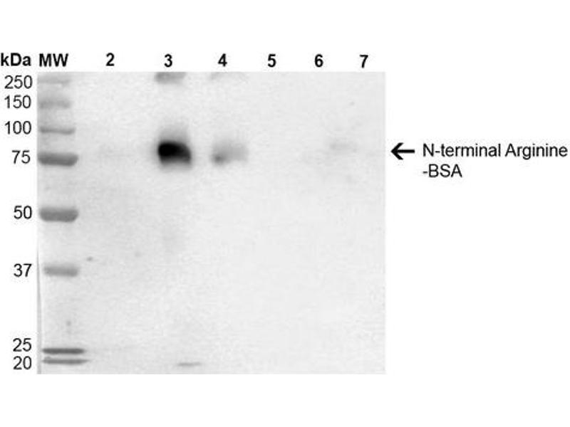 A 1:1000 dilution of ABIN5066985 was sufficient for detection of N-terminal Arginylation in 0.5 ug of N-terminal Arginine peptide conjugated to BSA by ECL immunoblot analysis using goat anti-mouse IgG:HRP as the secondary antibody.