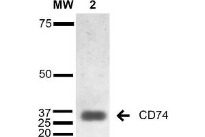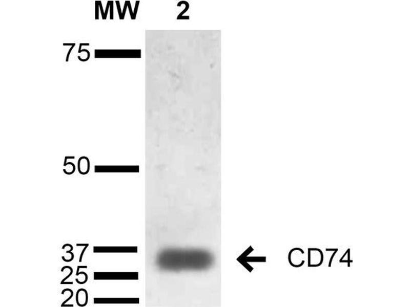 A 1:1000 dilution of ABIN5067037 was sufficient for detection of CD74 in 15 μg of B-Cell Lymphoma cell line Raji by ECL immunoblot analysis using Goat Anti-Mouse IgG:HRP as the secondary Antibody.