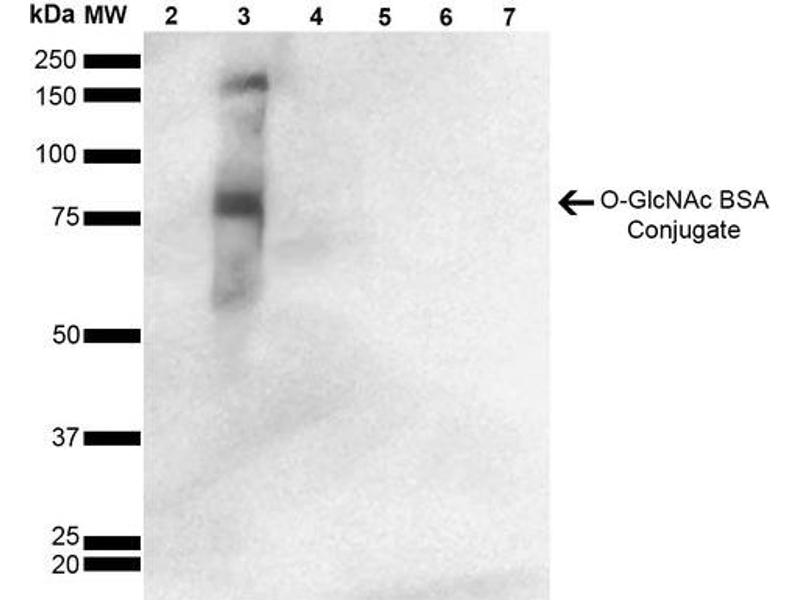 A 1:1000 dilution of ABIN5067140 was sufficient for detection of O-GlcNAc in 2 μg of O-GlcNAc conjugated to BSA by ECL immunoblot analysis using Goat Anti-Mouse IgG:HRP as the secondary Antibody.