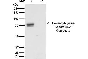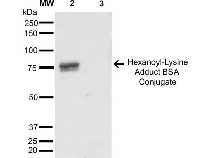 A 1:1000 dilution of ABIN5067237 was sufficient for detection of Hexanoyl Lysine adduct in 0.5 μg of Hexanoyl Lysine conjugated to BSA by ECL immunoblot analysis using Goat Anti-Mouse IgG:HRP as the secondary Antibody.