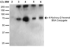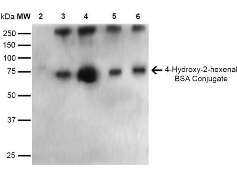 A 1:1000 dilution of ABIN5067287 was sufficient for detection of 4-Hydroxy-2-hexenal in 0.5 μg of 4-Hydroxy-2-hexenal conjugated to BSA and 4-Hydroxy nonenal conjugated to BSA by ECL immunoblot analysis using Goat Anti-Mouse IgG:HRP as the secondary Antibody.