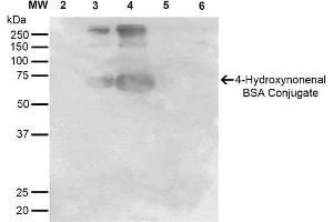 A 1:1000 dilution of ABIN5067300 was sufficient for detection of 4-Hydroxynonenal in 0.5 μg of 4-Hydroxynonenal conjugated to BSA by ECL immunoblot analysis using Goat Anti-Mouse IgG:HRP as the secondary Antibody.