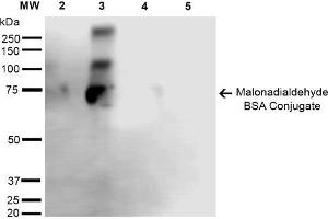 A 1:1000 dilution of ABIN5067343 was sufficient for detection of Malondialdehyde in 2 μg of Malondialdehyde conjugated to BSA by ECL immunoblot analysis using Goat Anti-Mouse IgG:HRP as the secondary Antibody.