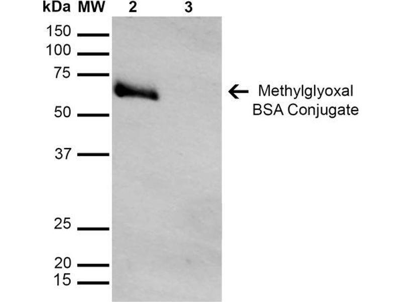 - Specific for Methylglyoxal modified proteins. Does not detect free Methylglyoxal. Does not cross-react with Acrolein, Hexanoyl Lysine, MDA, 4-HHE, 4-HNE, or Crotonaldehyde modified proteins.