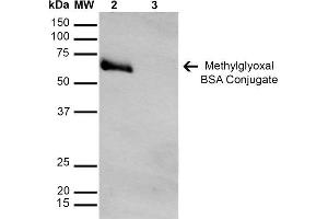 A 1:1000 dilution of ABIN5067410 was sufficient for detection of Methylglyoxal in 0.5 μg of Methylglyoxal conjugated to BSA by ECL immunoblot analysis using Goat Anti-Mouse IgG:HRP as the secondary Antibody.