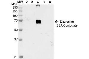 A 1:1000 dilution of ABIN5067464 was sufficient for detection of dityrosine in 1 μg of Dityrosine conjugated to BSA by ECL immunoblot analysis using Goat Anti-Mouse IgG:HRP as the secondary Antibody.