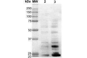 A 1:1000 dilution of ABIN5067485 was sufficient for detection of dityrosine in 1 μg of Dityrosine conjugated to BSA by ECL immunoblot analysis using Goat Anti-Mouse IgG:HRP as the secondary Antibody.