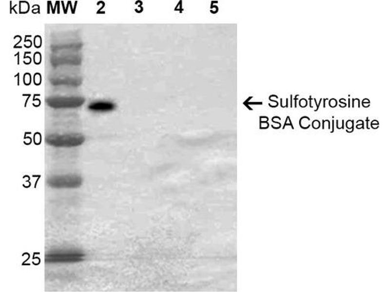 A 1:1000 dilution of ABIN5067497 was sufficient for detection of Sulfotyrosine in 0.5 μg of Sulfotyrosine conjugated to BSA by ECL immunoblot analysis using Goat Anti-Mouse IgG:HRP as the secondary Antibody.