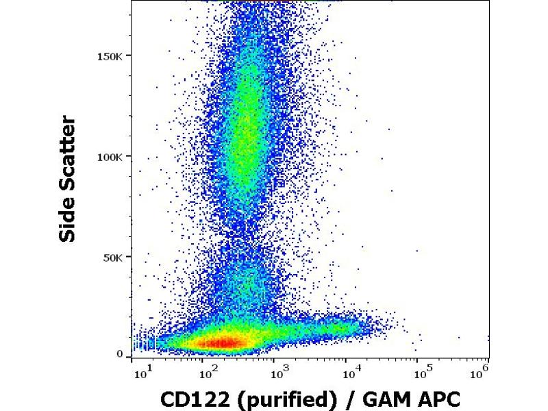The mouse monoclonal antibody TU27 recognizes an extracellular epitope of CD122 (IL-2R beta), a 70-75 kDa type I transmembrane glycoprotein constitutively expressed by NK cells and a T cell subset, and upregulated upon activation.