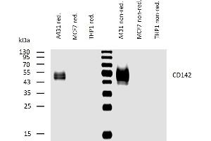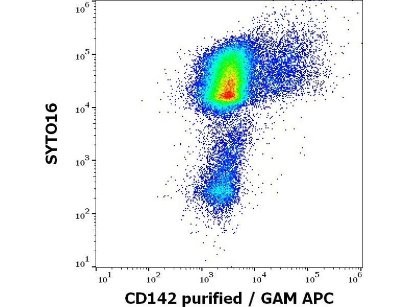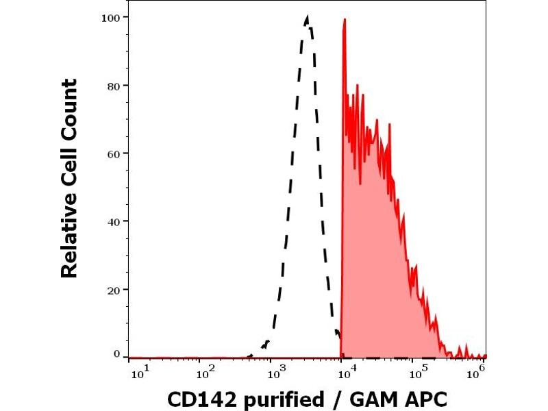 The mouse monoclonal antibody HTF-1, also known as HTF1-7B8, recognizes an extracellular epitope of CD142 (tissue factor, coagulation factor III), a type I glycoprotein expressed on endothelial cells, monocytes, macrophages, and platelets upon induction by inflammatory mediators, and expressed constitutively by some tumors, the vasculature, placenta, kidney, and central nervous system.