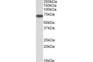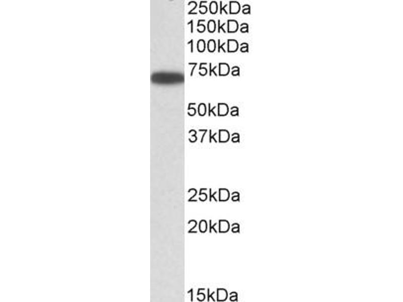 Western Blot: Approx 70 kDa band observed in lysates of cell lines A431, HeLa, Jurkat (calculated MW of 54.4 kDa according to NP_055399.1). The observed molecular weight corresponds to the glycosylated form. Recommended concentration: 0.1-0.3 μg/mL. Primary