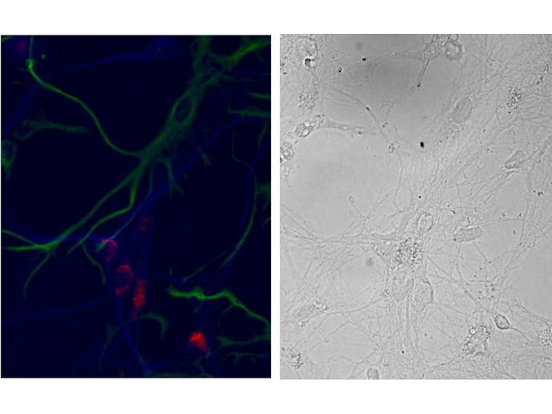 Immunocytochemistry: Primary DIV9 cells from Hippocampus E18 Rat embryos, stained for neuronal marker MAP2 in blue and for glial marker GFAP in green showed exclusive labelling of EB11637 (red) in the neurons only. Recommended concentrat